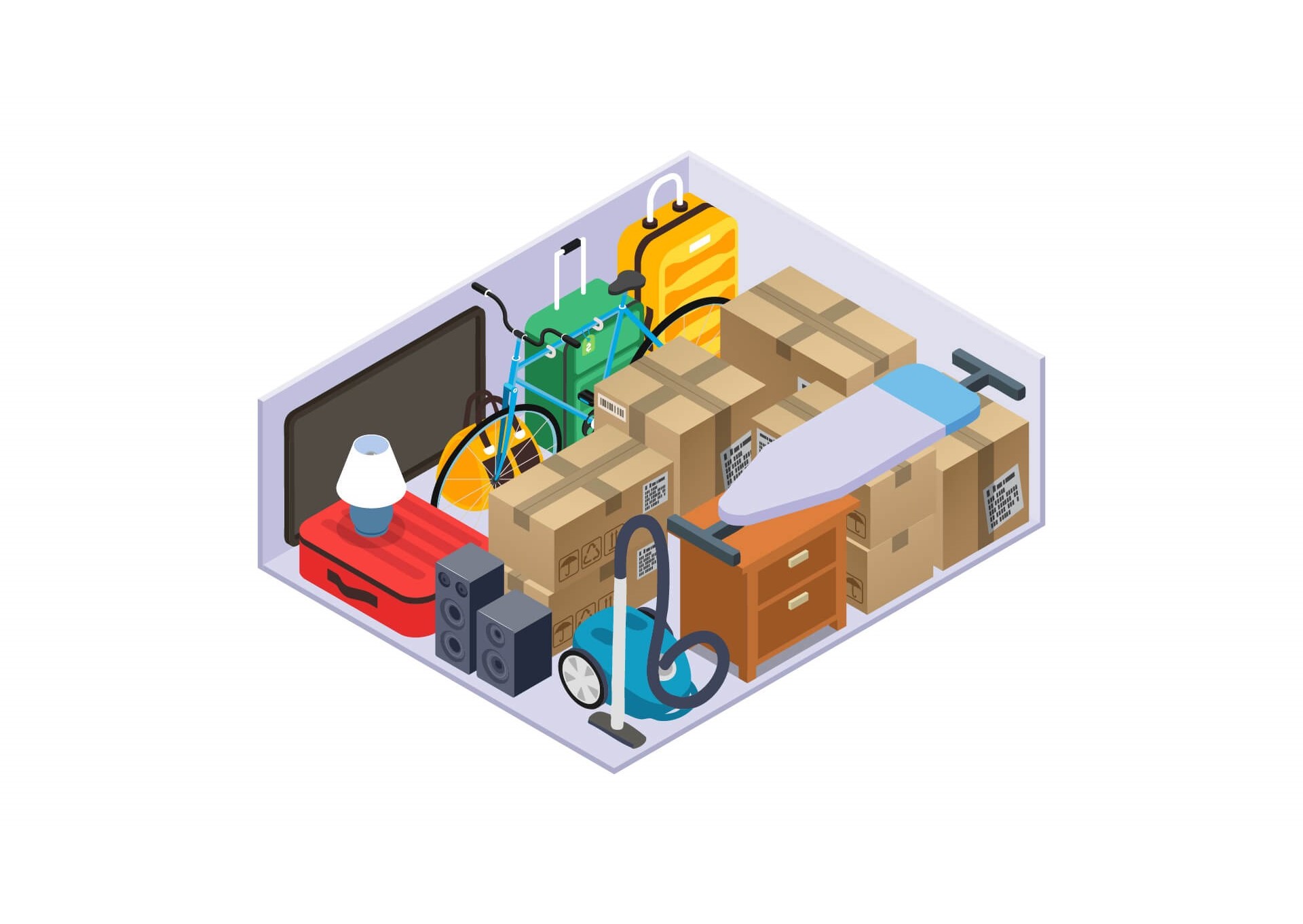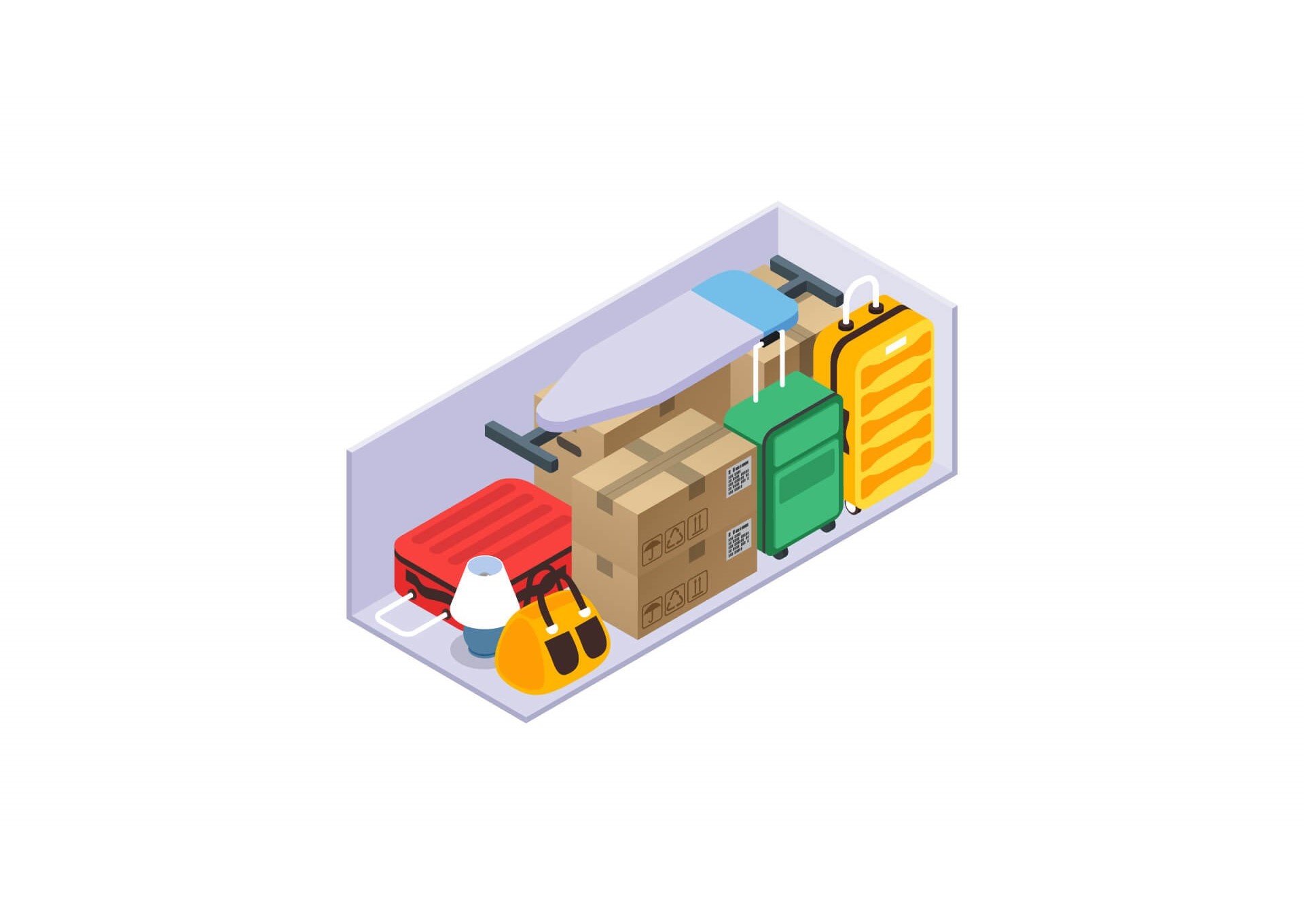 Can easily fit 2 large suitcases, 2 medium suitcases, 2 Large Boxes, ironing board & smaller bags/boxes